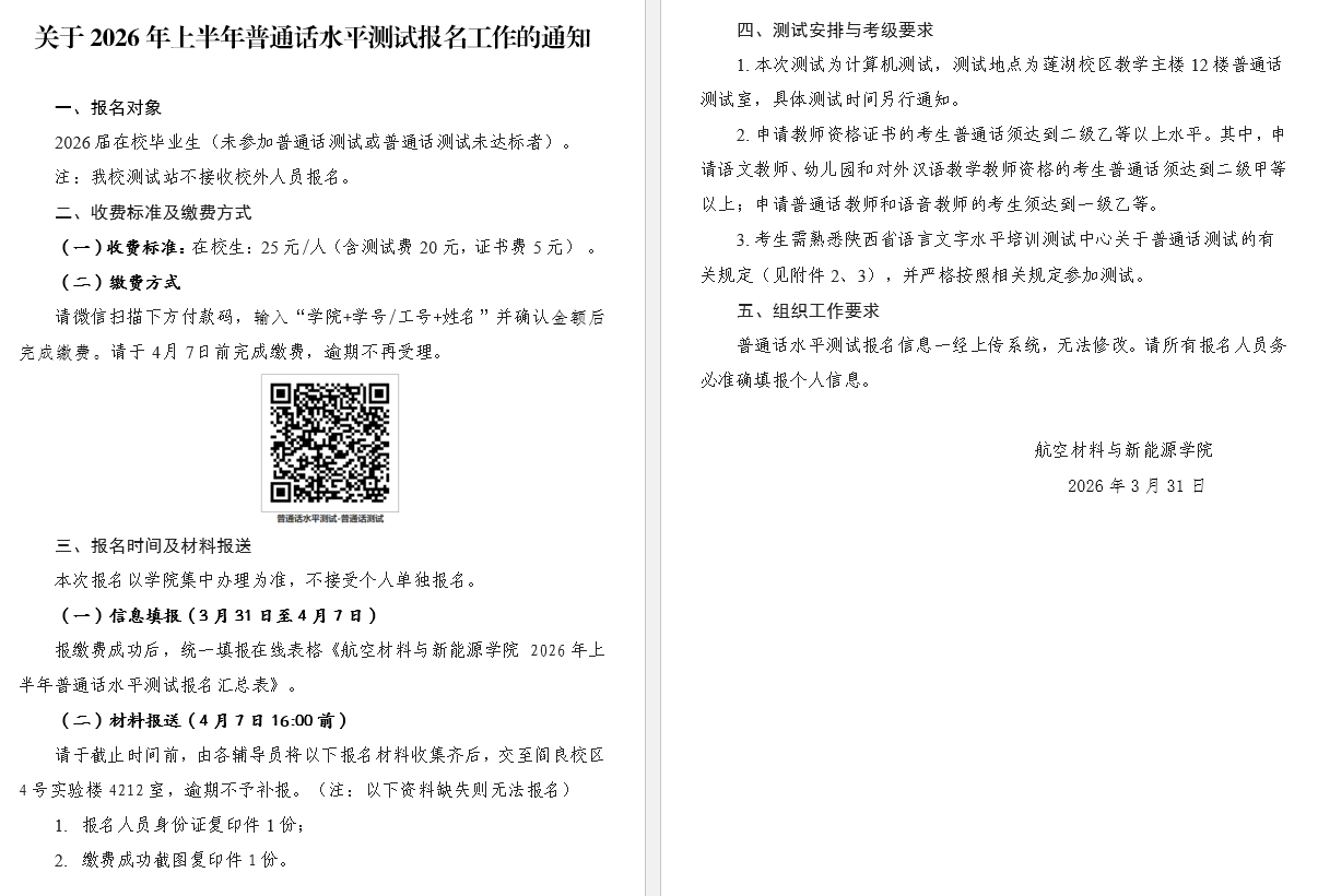 2026年上半年普通话水平测试报名工作已经启动,报名及材料提交截止时间为4月7日下午4点。 具体报名信息和步骤详见以下通知内容。 如有问题,请将问题集中汇总至辅导员处,由辅导员与综合办沟通解决。